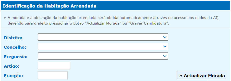• Artigo e fração da habitação (constam no contrato de arrendamento no Portal das Finanças), ou no caso de uma candidatura sem contrato de arrendamento, o artigo e fração poderão ser extraídos da Caderneta Predial Urbana da habitação que será objeto do futuro contrato. Em breve poderão ser submetidas candidaturas sem os dados cadastrais da habitação;
